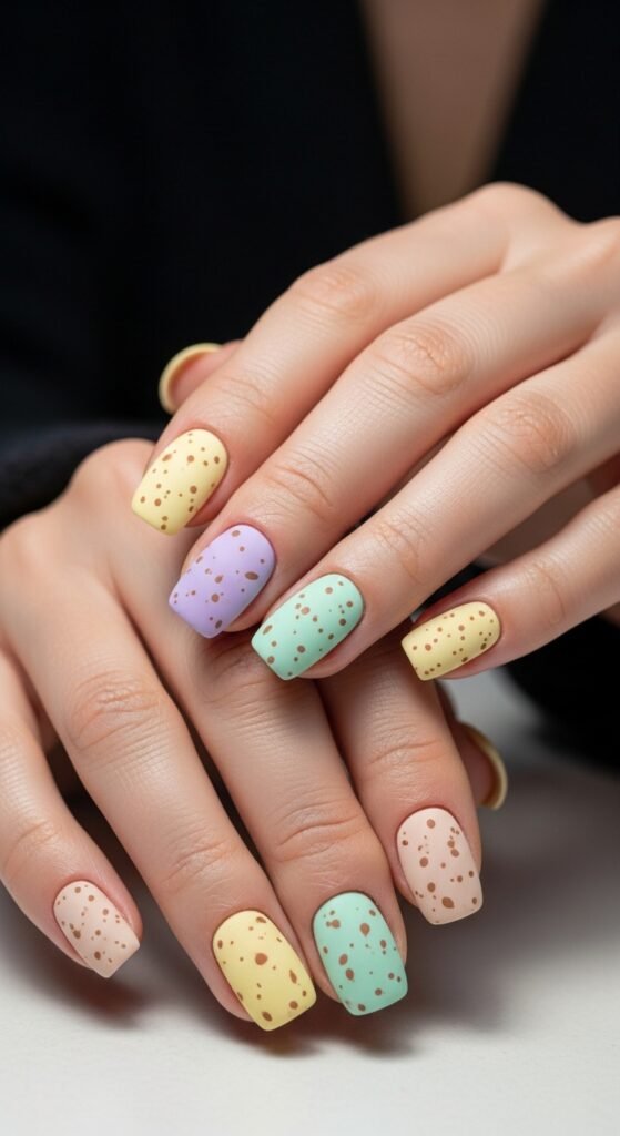 You can easily do this at home. Paint your nails a pastel color. Then, take a fan brush or an old toothbrush, dip it in a little black acrylic paint or polish, and gently flick the bristles to splatter tiny dots onto your nails. Finish with a matte top coat for the realistic eggshell look.