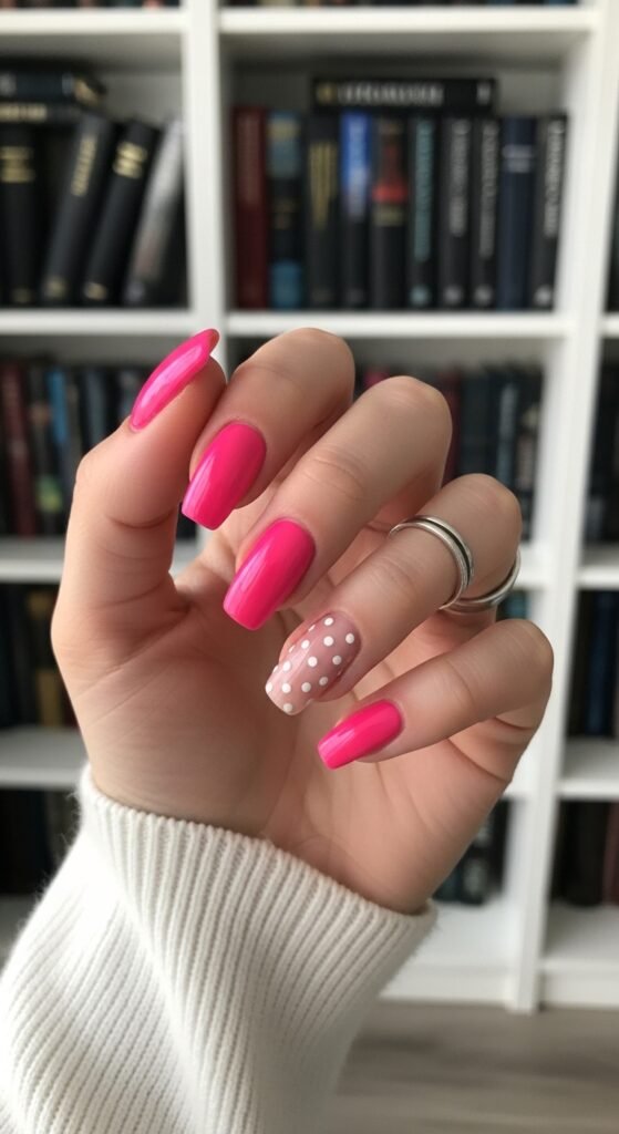 - Bright Pink and Soft Pink Square Nails with Polka Dot Accents