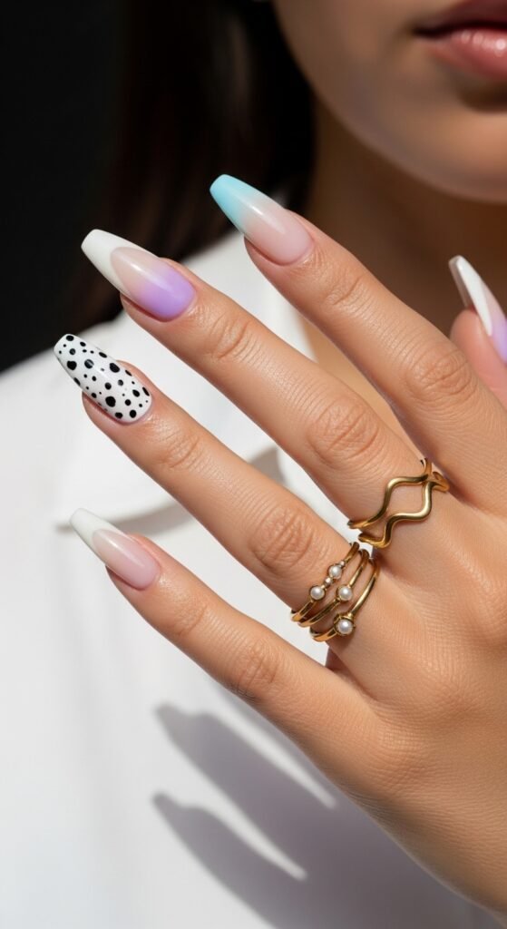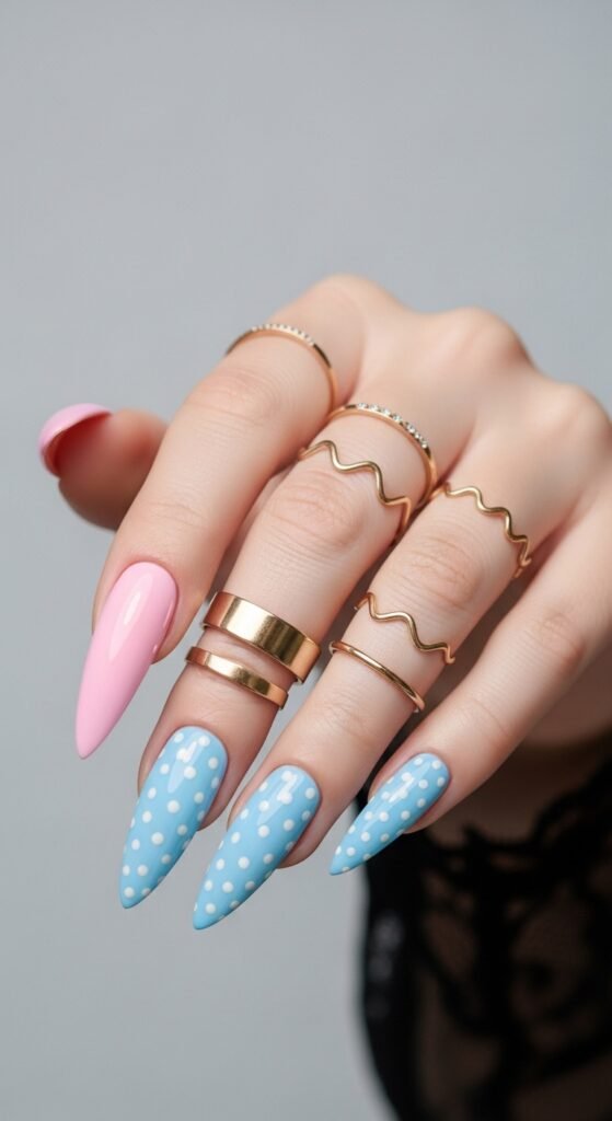 - Pastel Pink and Blue Stiletto Nails with Polka Dot Accents