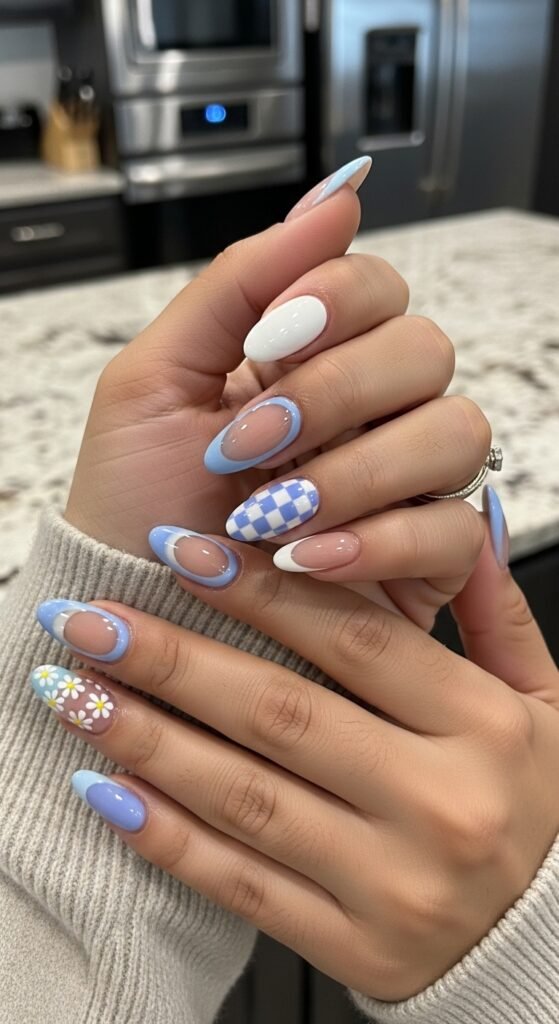 Pastel Blue and Pink Almond Nails Adorned with Delicate White Flowers and Gingham Patterns
