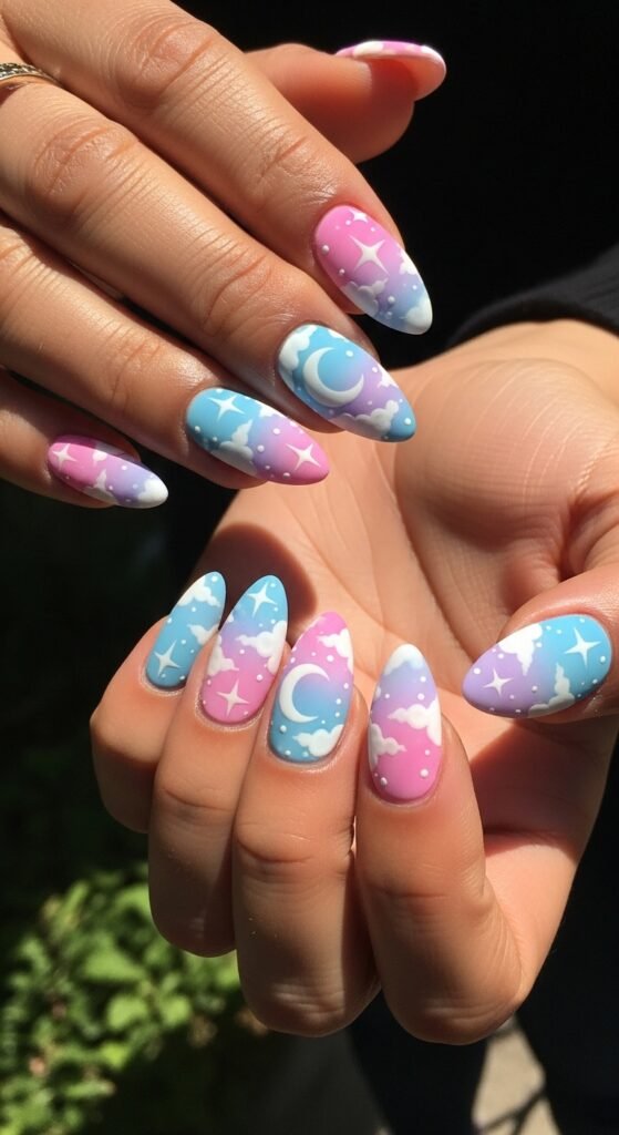 - Celestial Opal Almond Nails with Moon and Star Accents