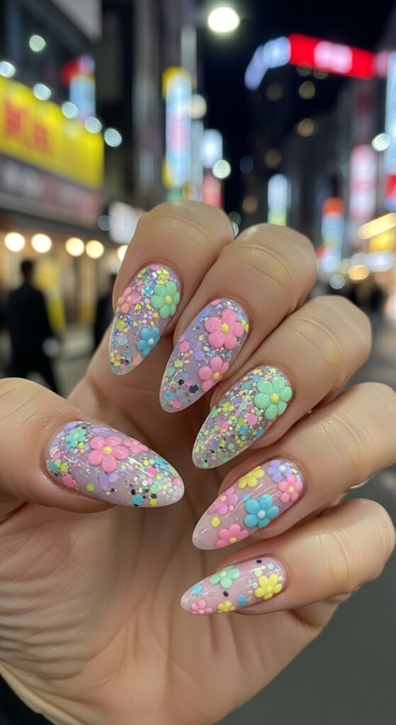 Imagine a party popper exploding on your nails. This design uses a clear or nude base loaded with pastel glitter shards in various shapes (hexagons, squares, triangles). Hand-painted flowers are layered on top of the glitter “confetti.”