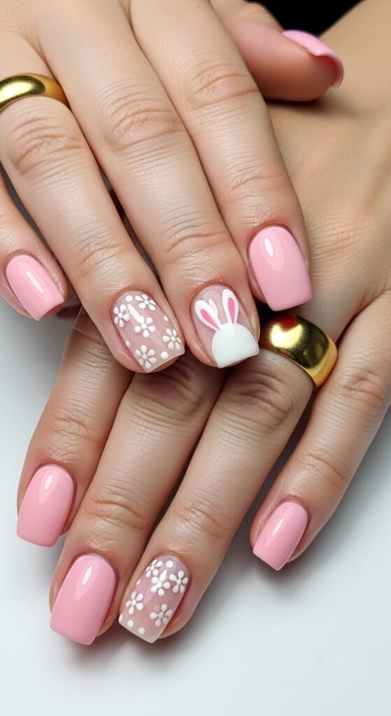 Negative space plays a huge role in modern nail art. This look combines a full coverage baby pink with nude nails that feature playful bunny ears peeking up from the cuticle or tip. The floral accents are kept minimal, often just three or four petals per flower, to maintain a sophisticated “clean girl” aesthetic.