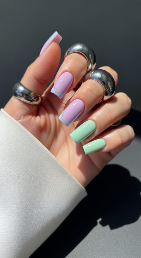 - Chic Pastel Lavender and Green French Tips on Medium-Length Square Nails