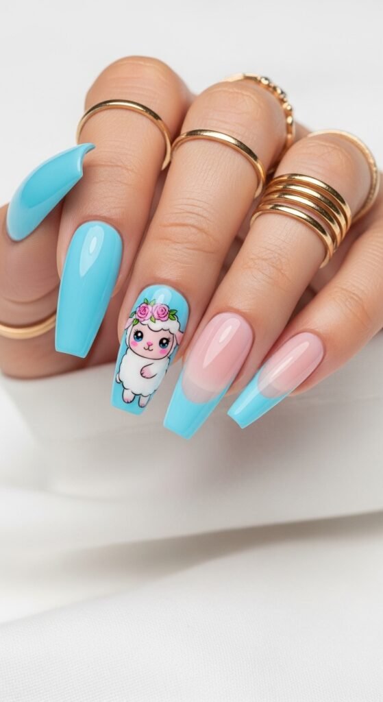 Soft Pink and Serene Blue Stiletto Nails with Lamb Accent Art