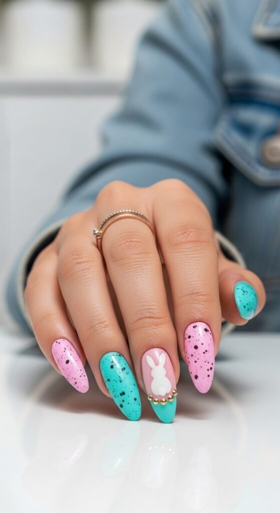 - Pastel Speckled Stiletto Nails Featuring a Cute Bunny Accent Design