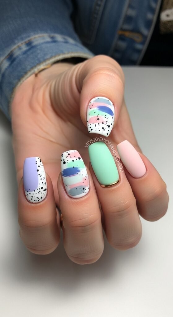 - Matte Squoval Nails with Pastel Hues, Black Speckles and Abstract Designs