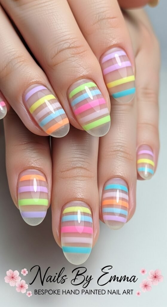 Pastel Striped Squoval Nails with Sheer Pink Base