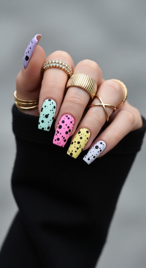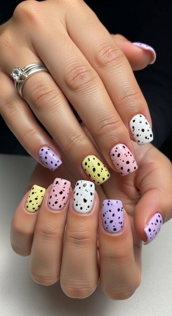 This is the “funfetti” cake look. Short square nails are painted in solid block colors of lavender, pink, white, and yellow. Large, colorful glitter dots (instead of black speckles) are applied on top.