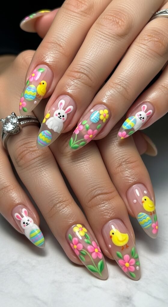 Beige Stiletto Nails with Playful Easter Bunny and Floral Accents
