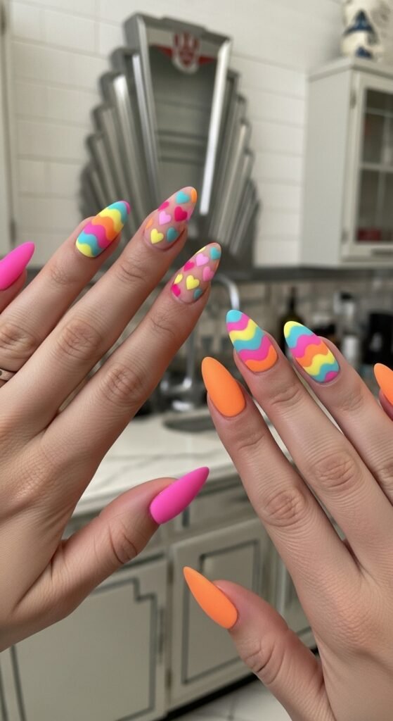 - Playful Pastel Almond Nails with Rainbow Swirls and Heart Accents