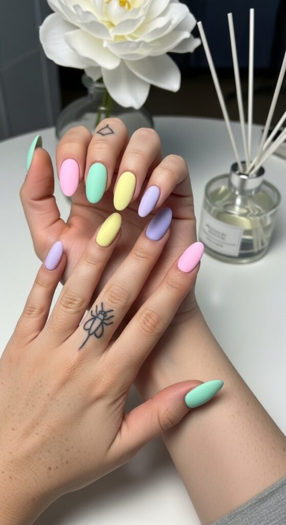 - Pastel Rainbow Matte Oval Nails in Soft Spring Hues