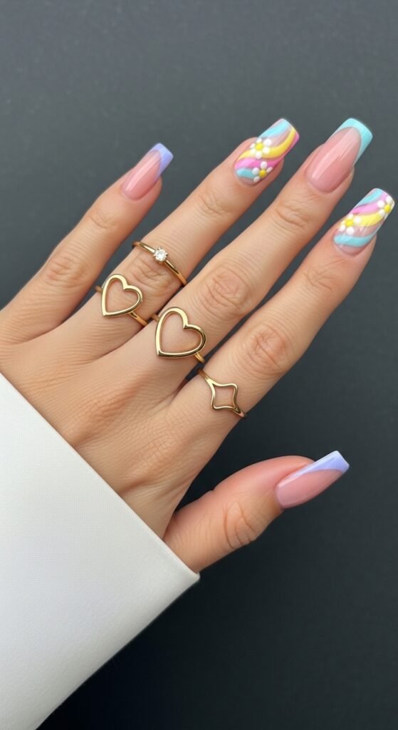 Playful Pastel Almond Nails with Rainbow Swirls and Heart Accents