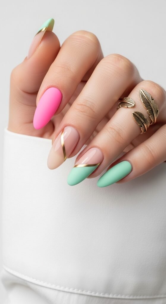 - Glossy & Matte Pastel Pink and Green Stiletto Nails with Golden Stripe Accents
