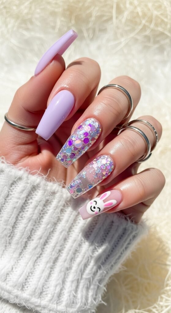 - Lavender Coffin Nails Featuring an Adorable Bunny Design and a Sparkling Glitter Accent