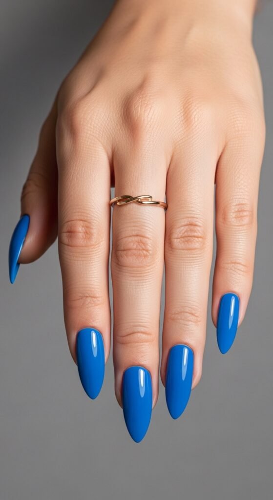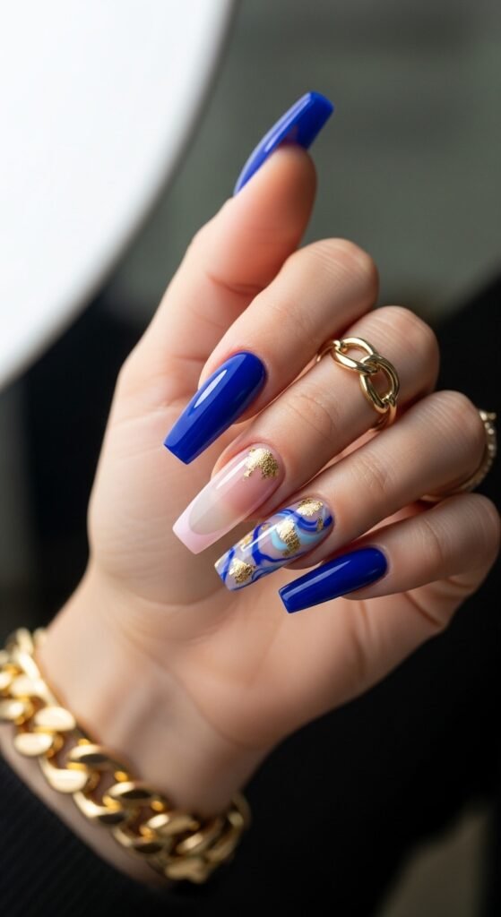 The coffin shape (long, tapered, with a flat tip) provides a large canvas for color. Painting this dramatic shape in a solid royal blue with a matte finish is a power move. It is bold, unapologetic, and trendy.