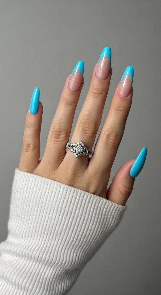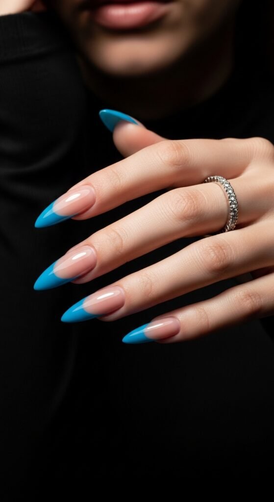 Update the classic French manicure by swapping the traditional white tip for a shocking electric cobalt blue. This design offers the best of both worlds: the clean, elongating effect of a nude base and the high-energy pop of a bold color. It is perfect for anyone who wants to experiment with bright blue but is afraid to commit to a full nail.