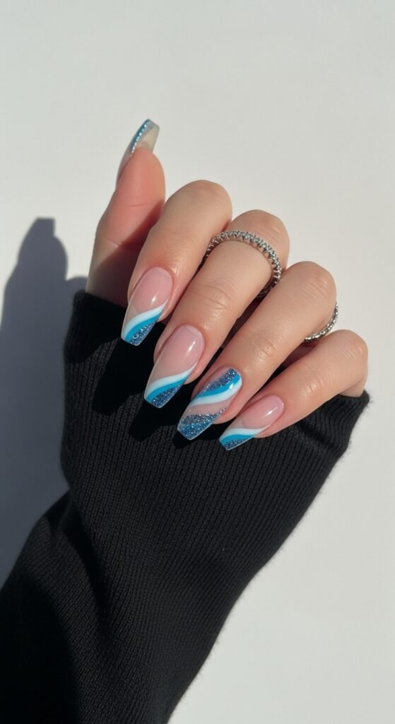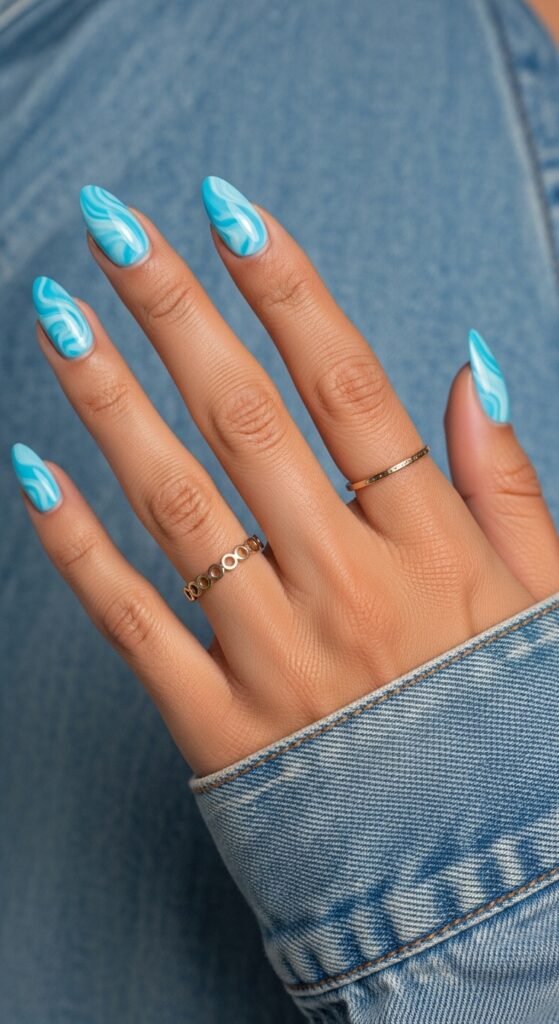 Abstract swirls are a fantastic way to wear blue without it feeling overwhelming. By using a nude base and painting organic, flowing lines in soft baby blue, you create movement and interest. This design is very forgiving because the lines are not meant to be perfect or symmetrical.