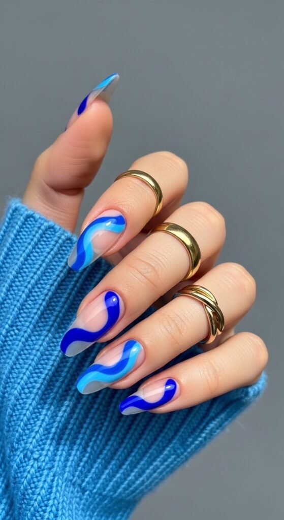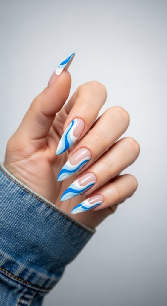 You can mix different shades of blue in the swirls—perhaps a baby blue paired with a darker denim shade—to add depth. This style lengthens the nail visually because the vertical curves draw the eye up and down. It is playful, youthful, and perfect for spring.