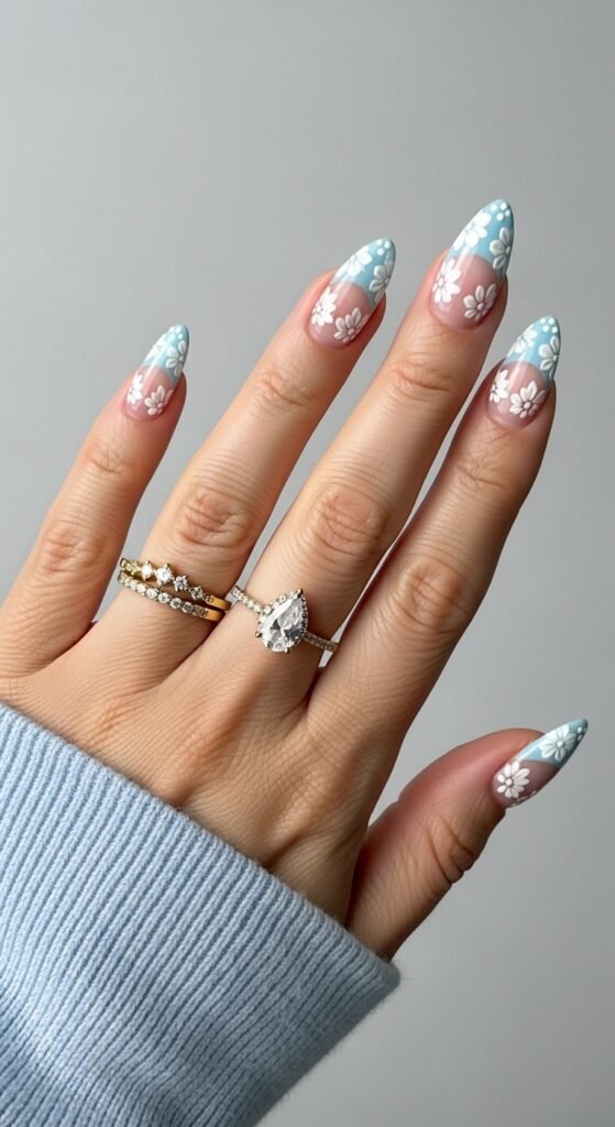 This look took social media by storm for a reason. It combines a creamy, sheer white base with a drop of baby blue, creating a milky finish that looks good enough to eat. Unlike a standard opaque pastel, the “milk” aspect gives it a semi-sheer quality that feels softer and more natural. It is the perfect transition shade from spring to summer because it is light but not stark white.