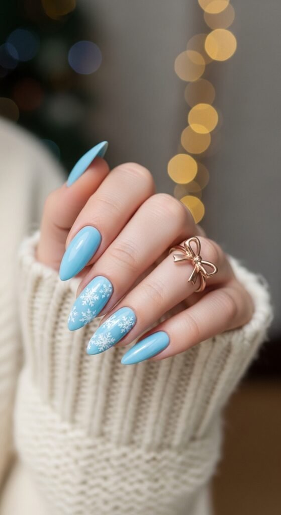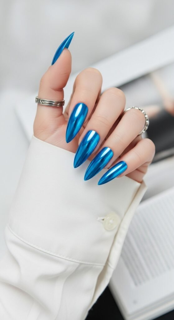 It is the easiest design on this list to do at home. All you need is a toothpick or a bobby pin. It adds a pop of color without committing to a full blue manicure. This style is very popular in high-fashion editorials for its restraint and elegance.