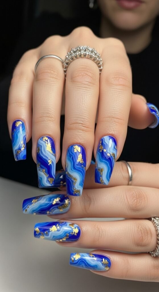 Pro Tip: Use a milky top coat over the blue layers before adding the gold to create depth, as if the gold is embedded in the stone.