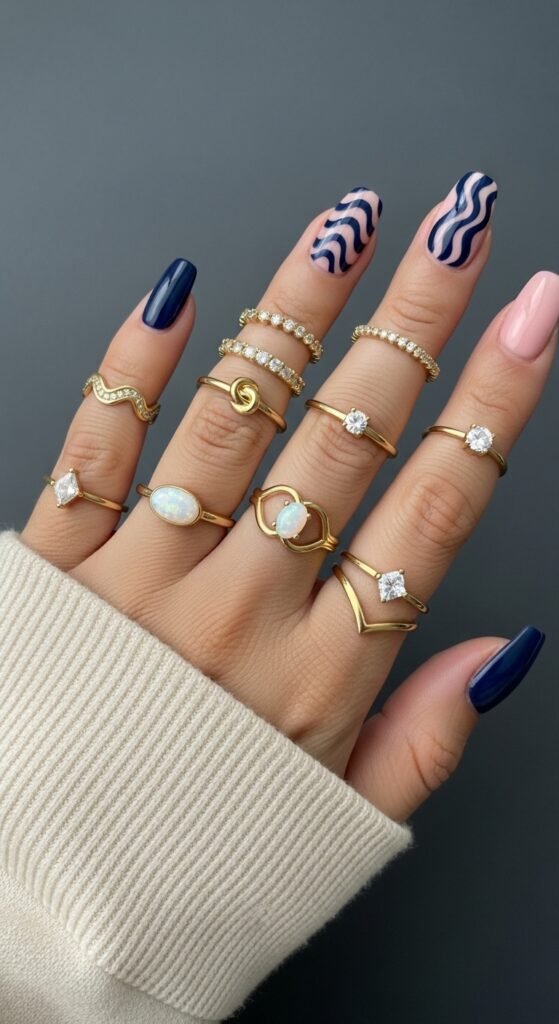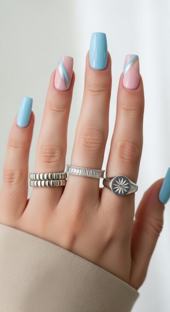 Negative space designs use the natural nail color as part of the art. Picture geometric blocks of navy blue and sky blue, separated by clear lines of your natural nail. It feels architectural and contemporary.