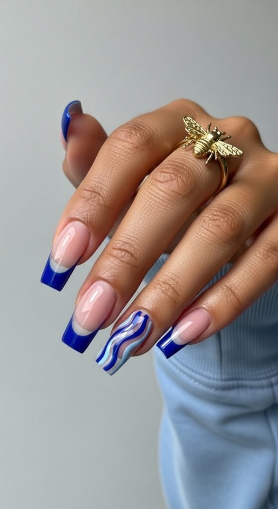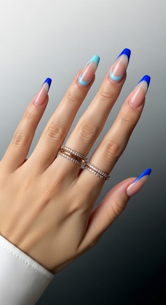 The key to this look is the sharpness of the “smile line” (where the nude meets the blue). Use a fine liner brush or a stencil to get that crisp edge. The electric blue draws the eye to the length of the nail, making it a great option for longer square or coffin shapes.