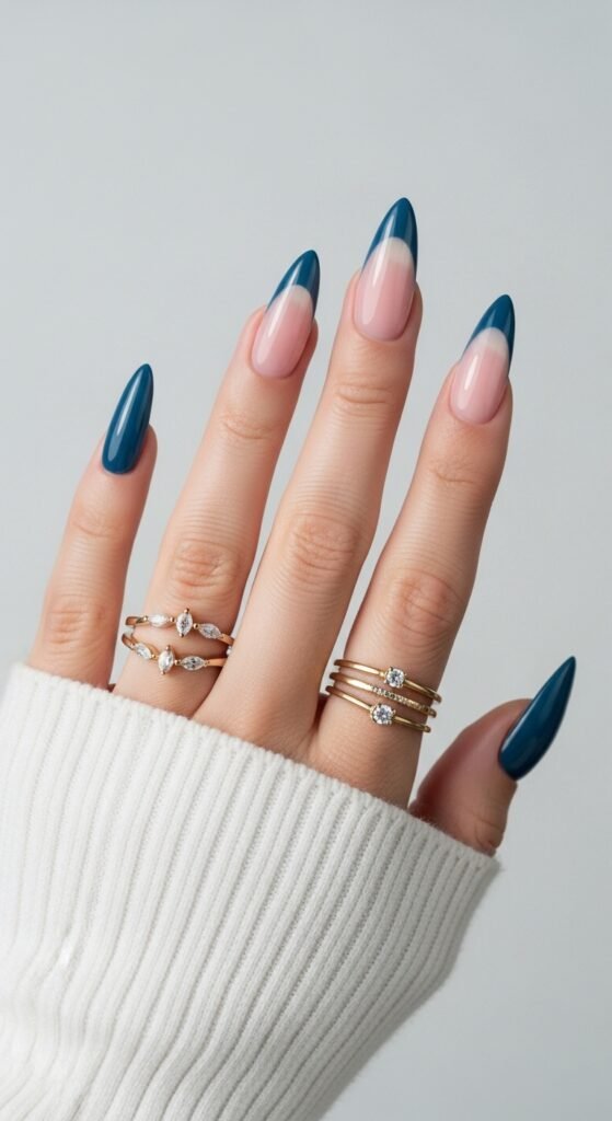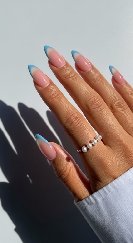 Pro Tip: Use a pink-toned nude base to prevent the nail from looking yellow against the cool blue tip.