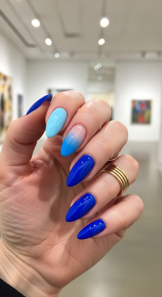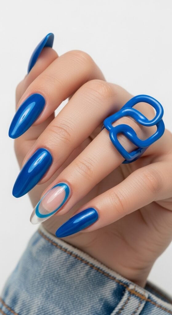 Sometimes less is more. Paint your nails a sheer nude or a very pale milky white. Then, place a single, small dot of bright blue at the base of the nail (near the cuticle) or at the very tip. This “micro-nail art” is incredibly chic and modern.