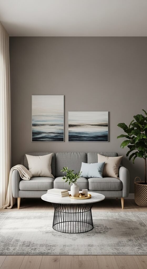 Do not overlook the power of art. Large-scale abstract art with grey undertones ties the room together. Alternatively, black and white photography looks gallery-quality against a grey wall. The key is to choose decor that shares a common design language, whether that is mid-century modern shapes or rustic farmhouse textures.