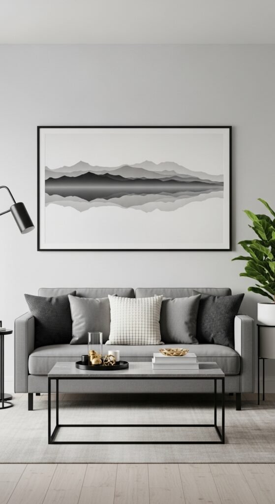 Start with grey walls and a grey sofa. Use black for hardware, picture frames, and lighting fixtures to add definition. Use white for textiles, rugs, and decorative objects to add brightness. This layered approach creates a sophisticated gradient. Patterned rugs featuring all three colors can tie the entire room together effortlessly.