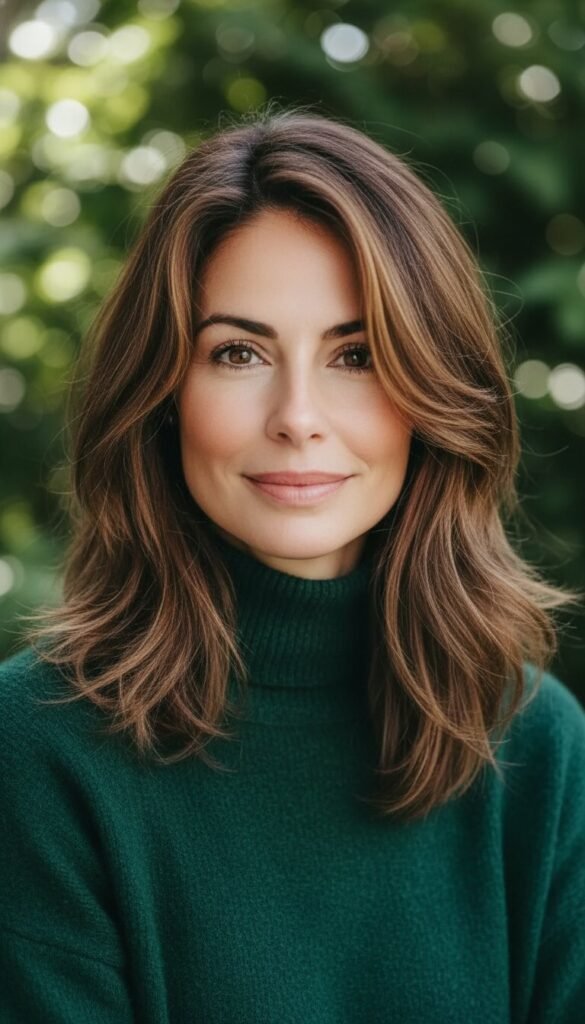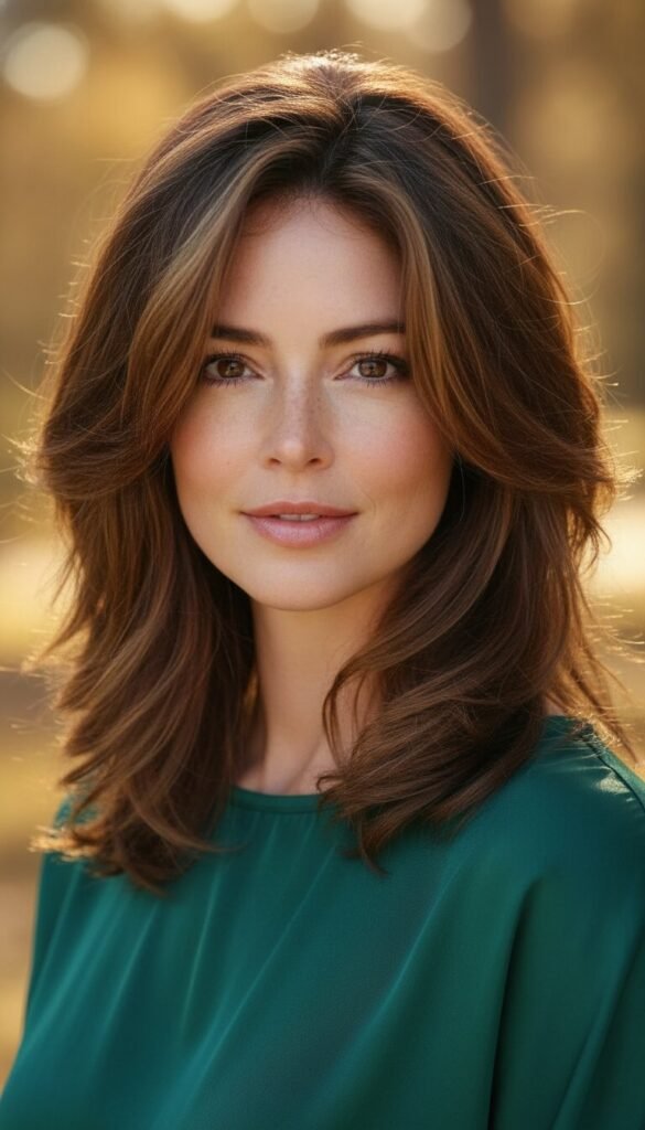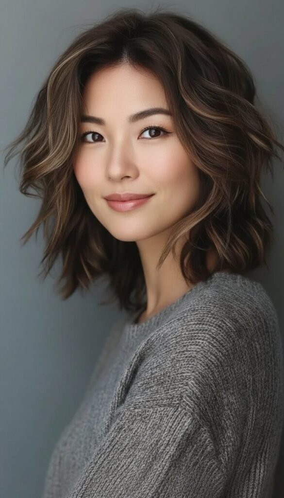 Drawing inspiration from the rich tones of autumn foliage, this style utilizes maple brown lowlights to add warmth and depth. The textured medium cut breaks up the hair’s surface, allowing the different brown tones to intermingle visibly. The lowlights are a slightly reddish-brown, which adds a vibrancy that flat, neutral browns lack. This style is perfect for brunettes who feel their hair color is “boring” but don’t want to go blonde. The texture creates a modern, piecey look that feels active and lively.