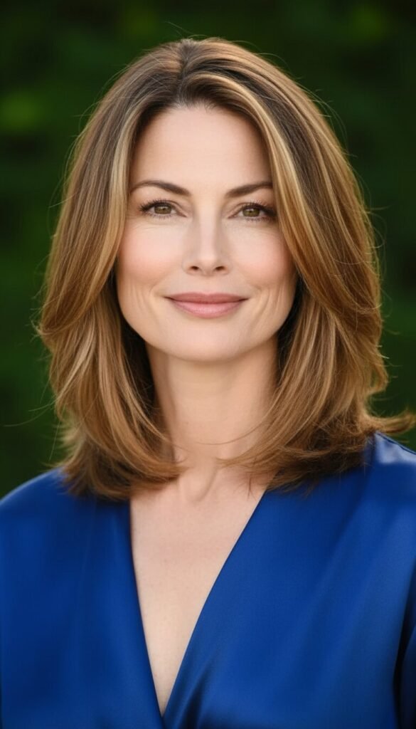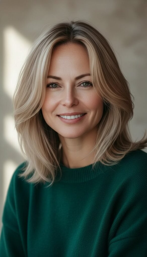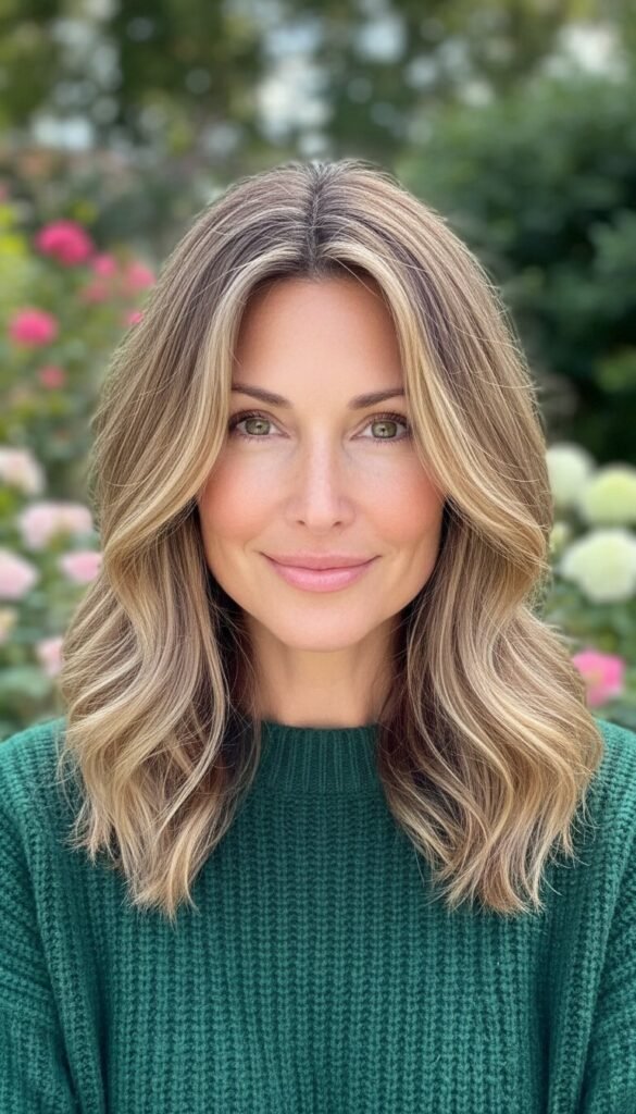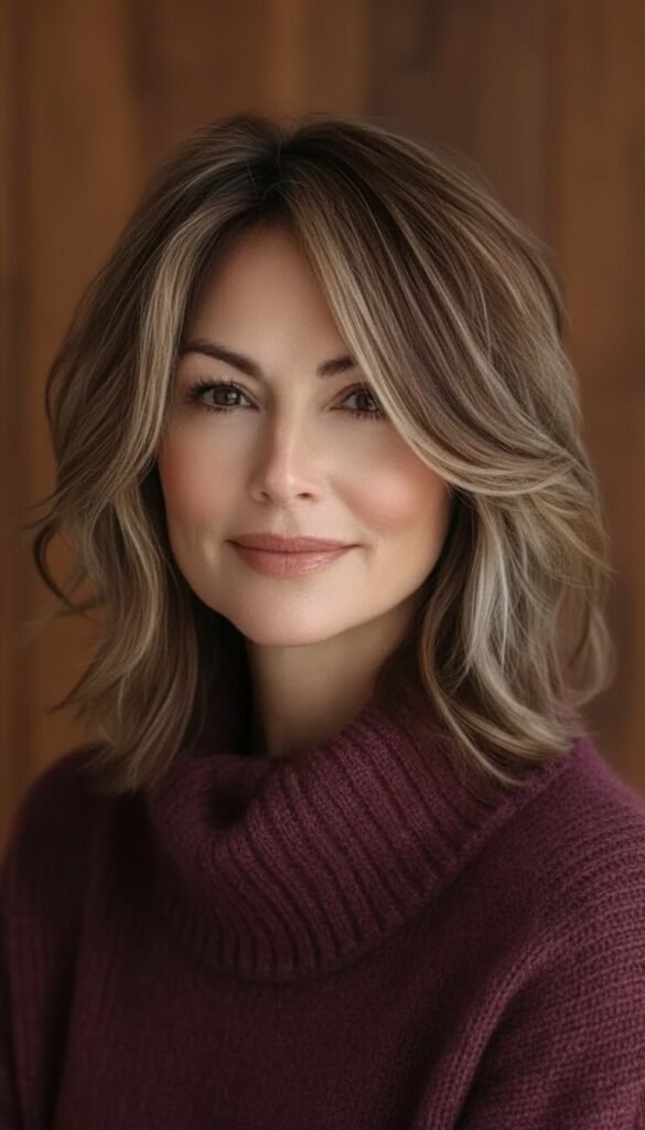 Face-framing layers are the ultimate tool for contouring without makeup. This style focuses on creating a “curtain” effect that drapes around the cheekbones and jawline, drawing attention to the eyes and smile. The sandy blonde accents are placed specifically on these shorter front pieces to act as a spotlight, illuminating the face. This technique uses the concept of focal points to guide the viewer’s gaze exactly where you want it. The rest of the hair remains a uniform medium length, providing a solid foundation for the dynamic front section. It is a perfect choice for those who want to keep their length but feel their current style is dragging their features down.