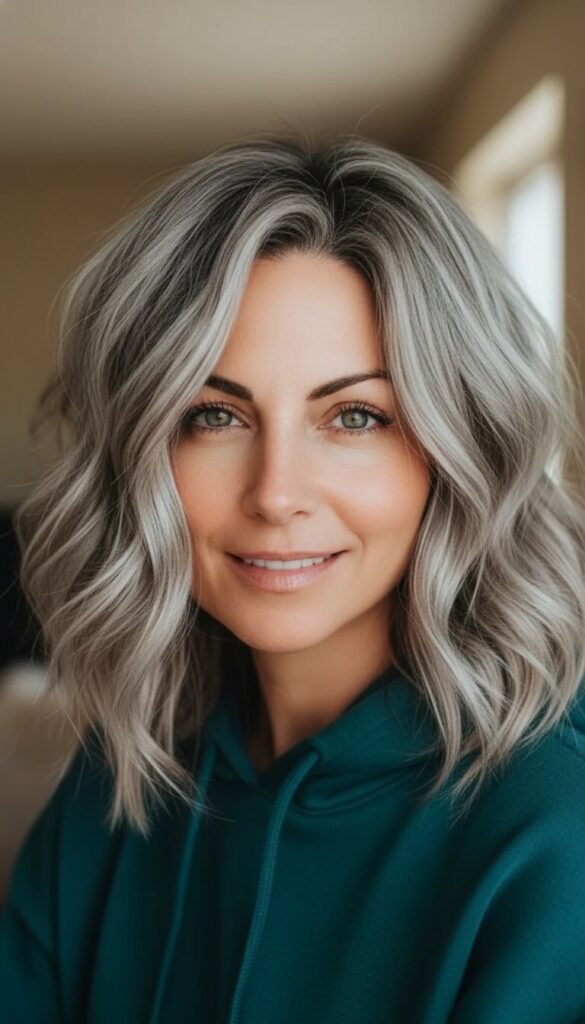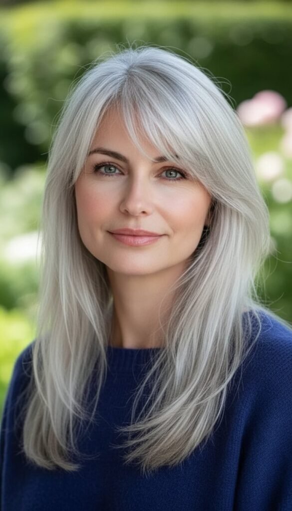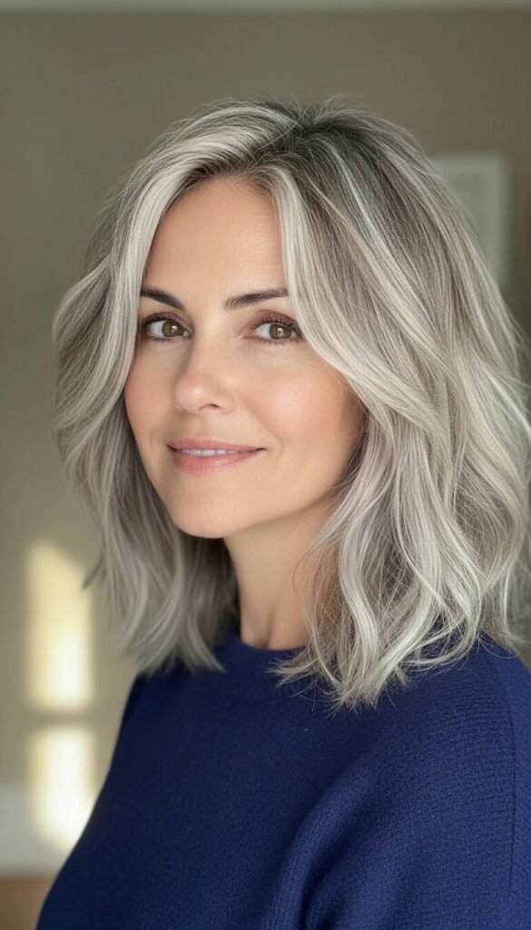 Embracing the grey trend or enhancing natural silver, this style is bold and empowering. The layered cut adds youthfulness and movement, preventing the silver hair from looking aging or dowdy. The silver accents can be natural greys enhanced with toner or artificially created highlights. The cool, metallic sheen of silver hair reflects light beautifully, especially on the edges of the layers. This style frames the face with brightness and makes a confident statement. It reclaims grey hair as a high-fashion color choice rather than something to be hidden.