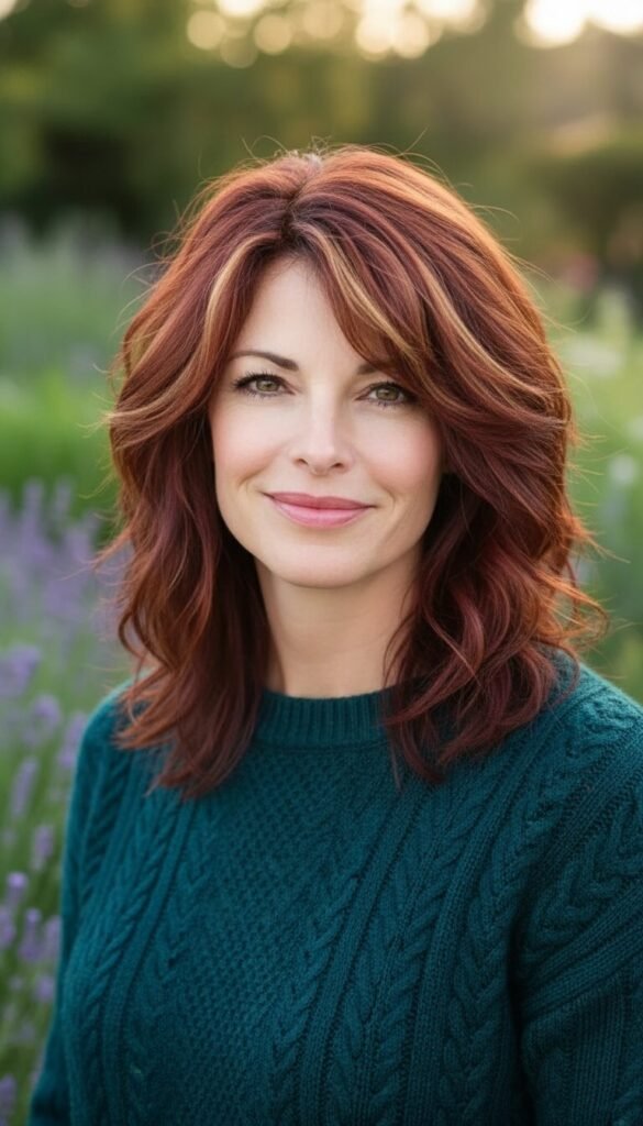 Embracing a retro-inspired aesthetic, the feathered shag brings volume and personality to medium length hair. This cut is characterized by short, wispy layers at the crown and longer, thinning layers toward the ends. The visual effect is one of lightness and airiness, making it ideal for fine hair that tends to fall flat. The soft auburn hues add warmth and richness, complementing the vintage vibe of the cut. The design principle here is focused on silhouette manipulation; by adding volume at the top and reducing it at the bottom, the face appears more lifted. Styling this cut involves enhancing the “flick” of the layers to create that signature feathered movement.