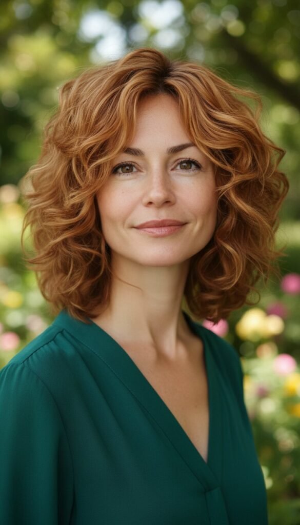 This style celebrates volume and richness. The medium length is perfect for holding loose curls that don’t get weighed down. The color palette is a mix of deep chestnut and glowing amber lowlights, creating a multifaceted brunette look. The amber tones catch the light on the curve of each curl, while the chestnut provides a dark backdrop that makes the amber pop. This interplay of light and dark emphasizes the spiral structure of the curls. It is a romantic, luxurious style that adds a lot of character to the hair.