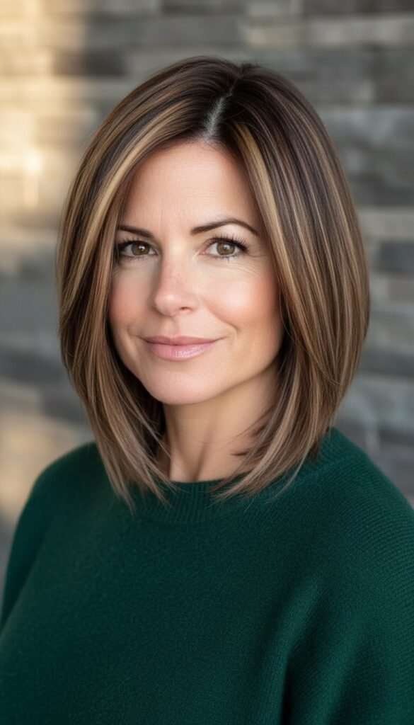 There is a quiet power in a straight, sleek lob. This cut is precision work at its finest, hitting the collarbone with a blunt, unwavering line. The light honey highlights soften the severity of the straight hair, adding a touch of warmth and approachability. The highlights are often concentrated around the face and the ends, creating a sun-kissed effect that looks natural. This style relies on the smoothness of the hair texture to reflect light, so it works best on hair that is naturally straight or easily straightened. It is a polished look that transitions effortlessly from a boardroom meeting to a dinner date.