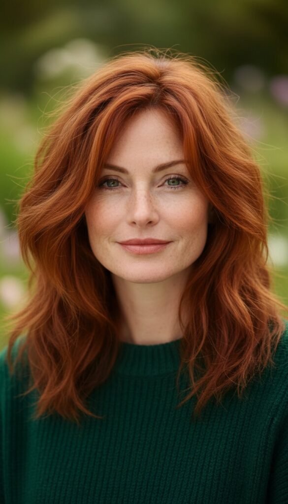 This is a bolder, more artistic take on the shag. The layers are choppy and disconnected, creating a lot of volume and messy texture. The tips of the layers are dipped in a vibrant copper shade, creating a “fire” effect. As the hair moves, the copper tips flash and dance, creating a dynamic visual experience. This style is for the woman who wants to express creativity and isn’t afraid of a little edge. The medium length ensures the style remains wearable and doesn’t veer into costume territory.