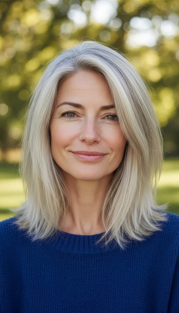 Mid-Length Cut with Soft Swoop Bangs in Platinum Blonde