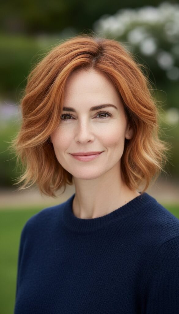 Warmth and softness define this approachable style. The lob is cut with soft, internal layering that encourages a natural wave pattern rather than fighting it. The cinnamon spice accents are painted in a balayage style, focusing on the mid-lengths where the waves bend. This red-brown tone adds a vibrant pop of color that warms up pale or neutral complexions. The combination of the soft wave and the spicy color creates a cozy, inviting look that feels organic and earthy. It is a fantastic transition style for fall or for anyone wanting to experiment with red tones without a full commitment.