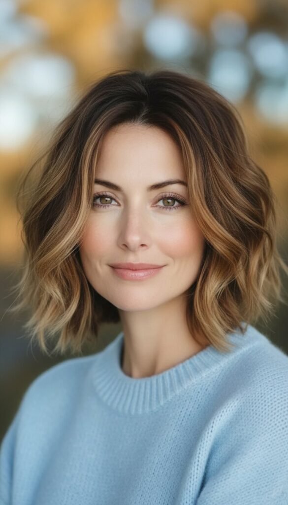 The wavy shoulder-length bob strikes a balance between the structure of a bob and the freedom of longer hair. This cut sits just above the shoulders, preventing the “flip” that often happens when hair hits the collarbone. The chestnut ombre creates a grounding effect, starting with a deep, natural root that transitions into a warm, inviting chestnut tone at the ends. This gradient draws the eye downward, emphasizing the movement of the waves. The design relies on the contrast between the dark roots and lighter ends to showcase the texture of the wave. It is an excellent choice for autumn or winter, bringing warmth to the complexion.