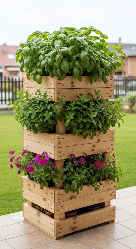 Strawberries are one of the most rewarding crops to grow, and a tiered planter maximizes the harvest in a tiny footprint. You can buy specialized strawberry pots or build a pyramid structure from wood.