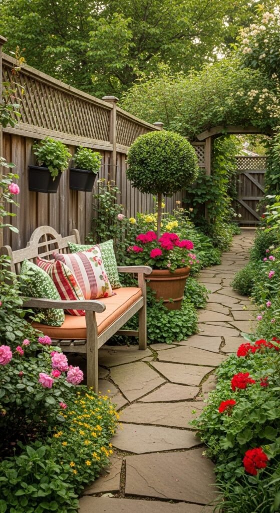 Look for benches made from weather-resistant woods like teak or eucalyptus, or durable resin options. You can style the bench with outdoor pillows to tie it into your garden’s color scheme. Placing the bench against a wall or fence allows you to grow climbing plants behind it, framing the seating area in greenery.