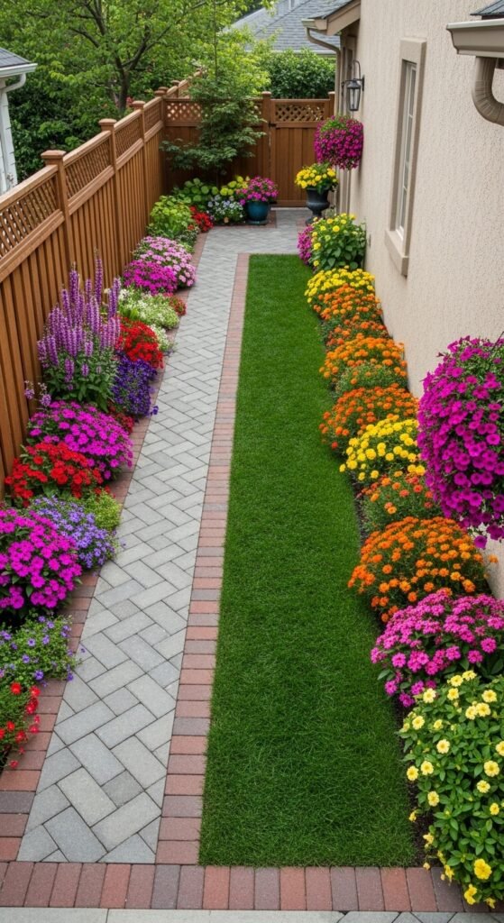 A flower border softens the edges of a backyard, blurring the boundary between the lawn and the fence. A well-planned border provides a succession of blooms from spring to fall, ensuring there is always color in the garden. By layering plants by height—tall at the back, medium in the middle, short at the front—you create a lush, full look that hides the bottom of fences.
