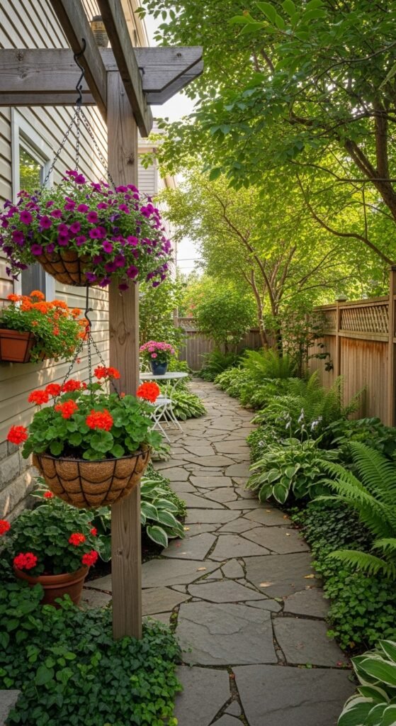 Hanging planters are a brilliant way to add color and life at eye level, breaking up the monotony of fences and siding. They draw the gaze upward, making a small yard feel more encompassing and immersive. The cascading foliage of trailing plants softens the edges of pergolas, porches, and roof overhangs. This layer of greenery adds a ceiling to your outdoor room, creating a cozy and enclosed feeling that promotes relaxation.