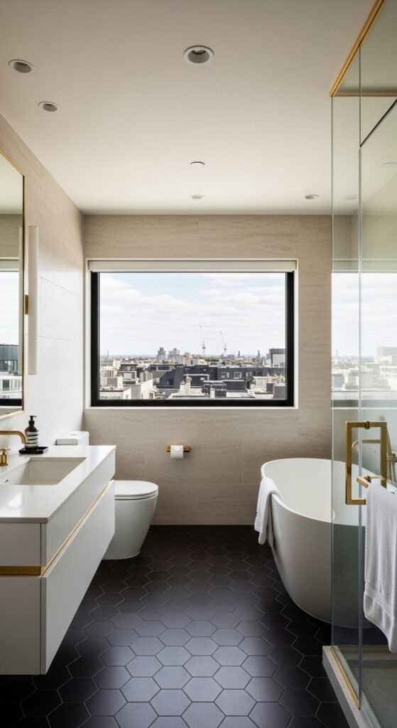 Pro Tip: Use a glass shower partition instead of a curtain to keep the visual line unbroken in small urban baths.