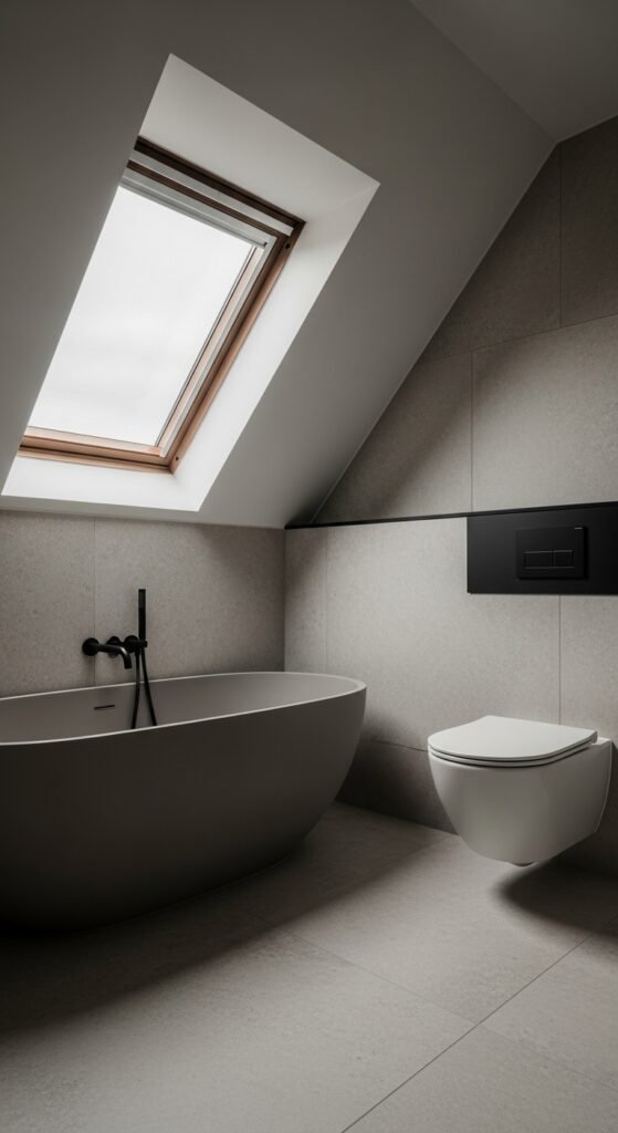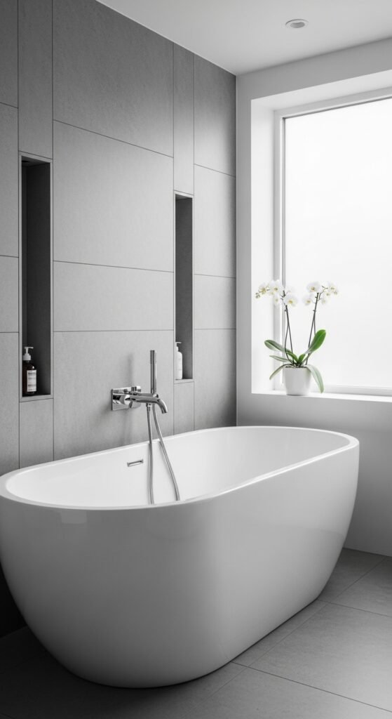 Monochrome does not have to mean boring. In this “Sleek Serenity” concept, the design relies on a strict palette of greys, from the palest silver to the deepest anthracite, to create visual interest. By removing other colors, you force the eye to notice form and texture. A curved freestanding bathtub becomes a sculptural masterpiece against a dark grey wall. A sharp, rectangular vanity stands out for its clean lines.