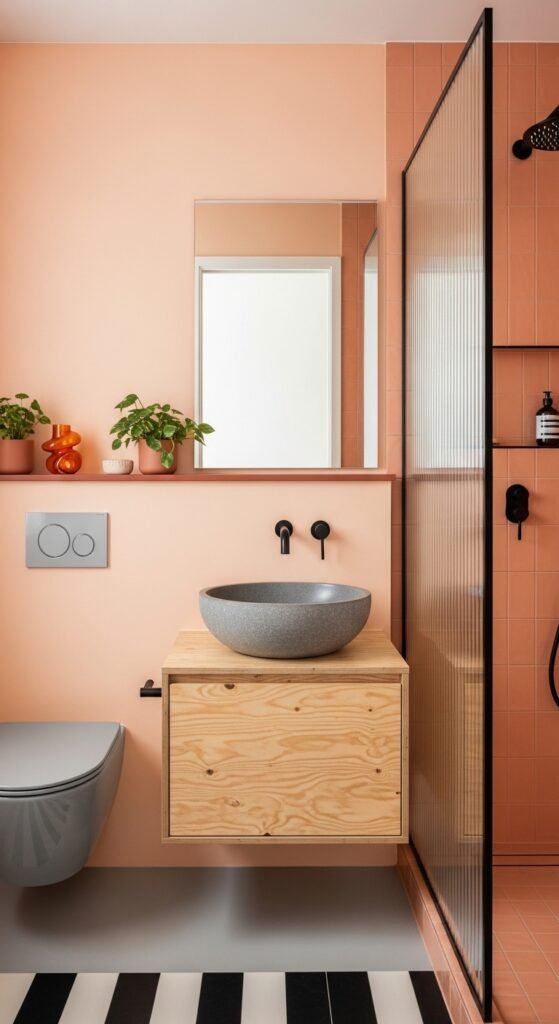 Grey acts as the perfect backdrop for earthy colors like terracotta, olive green, or rusty orange. In this design, a grey foundation (floors and walls) supports accessories or a vanity in these rich earth tones. It grounds the color, preventing it from overwhelming the space.