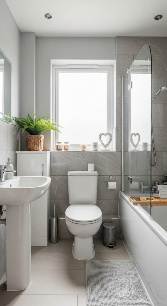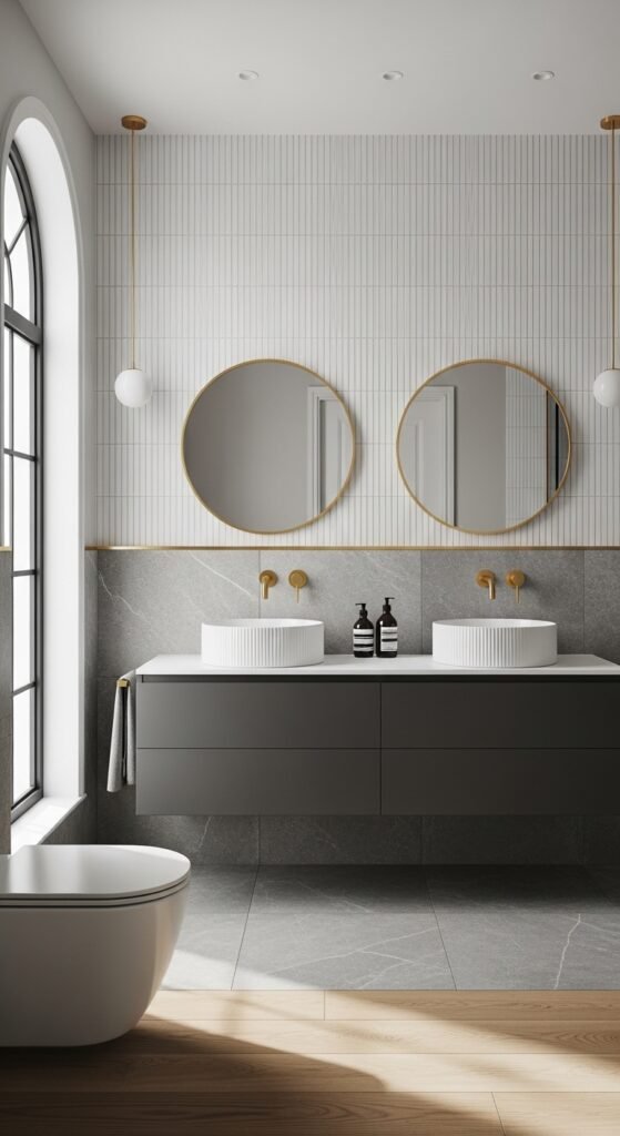 Mirrors are the secret weapon of the interior designer, and “Reflections of Serenity” uses them to maximum effect. In a grey bathroom, mirrors do two things: they double the light and they break up the solid walls. This design often features wall-to-wall mirroring or multiple mirrors arranged artistically. The reflection of grey tiles creates an infinite loop of cool, calming tones.